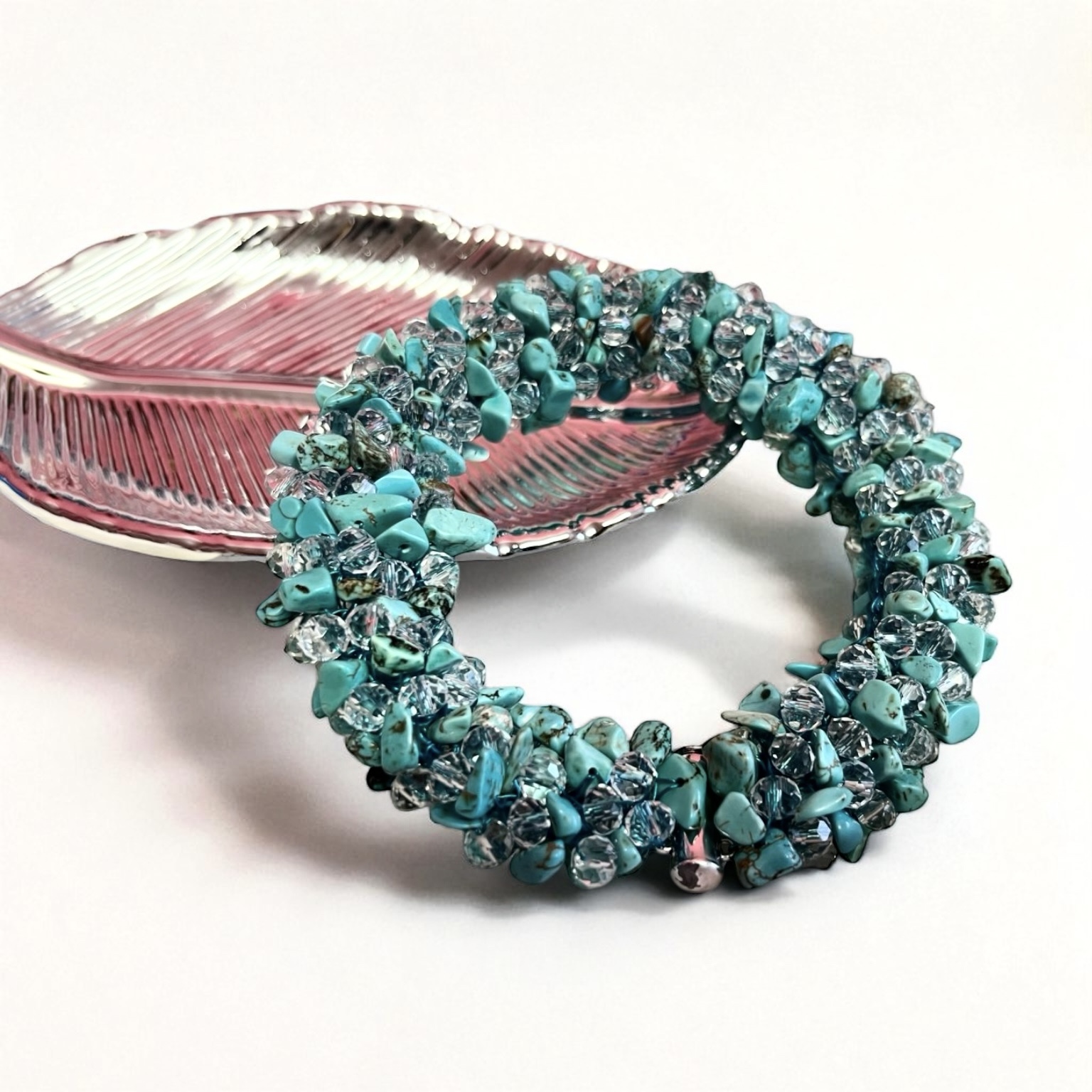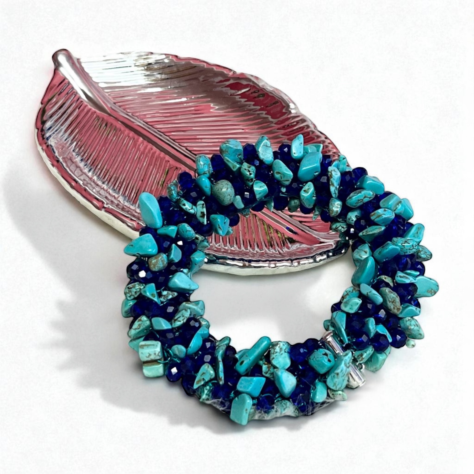 I get so many compliments, much prettier in person, this bracelet compliments my dark attire nicely! The bold colour of the turquoise gems are very charming combined with the sparkling crystals. WOW.